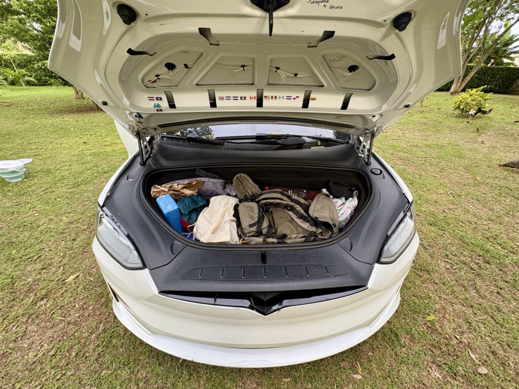 Beluga is a 2023 Tesla Model X Long Range, with a total of 183 Liters (6.5 Cubic Feet) of storage capacity underneath the hood. This is where I keep my charging, hiking, recovery gear, and anything that can get stinky in the main cabin like my dirty laundry. I know this looks a bit chaotic, but trust me, there is order to this madness.